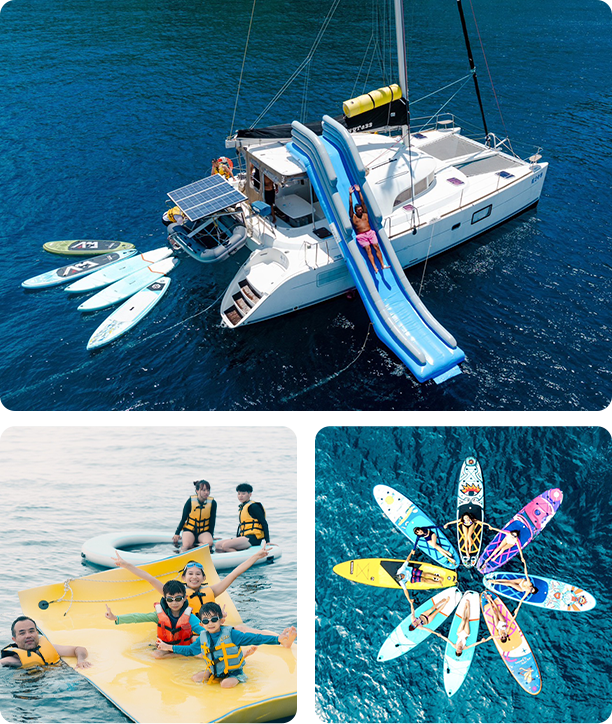 海上溜滑梯*1、造型泳圈*2、海上泡澡池*1、SUP*5組(槳5支)輪流使用、救生衣、杯水